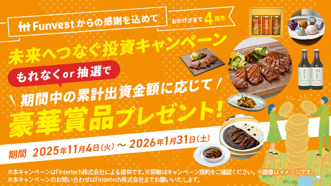 | 条件詳細 | ①キャンペーン期間内に募集開始されるファンドに累計100万円以上投資する ②Funvestに投資したことのない方が、キャンペーン期間内に初投資をする |