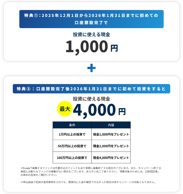 会員登録と出資で、最大5,000円分の現金がキャッシュバックがプレゼントされます。