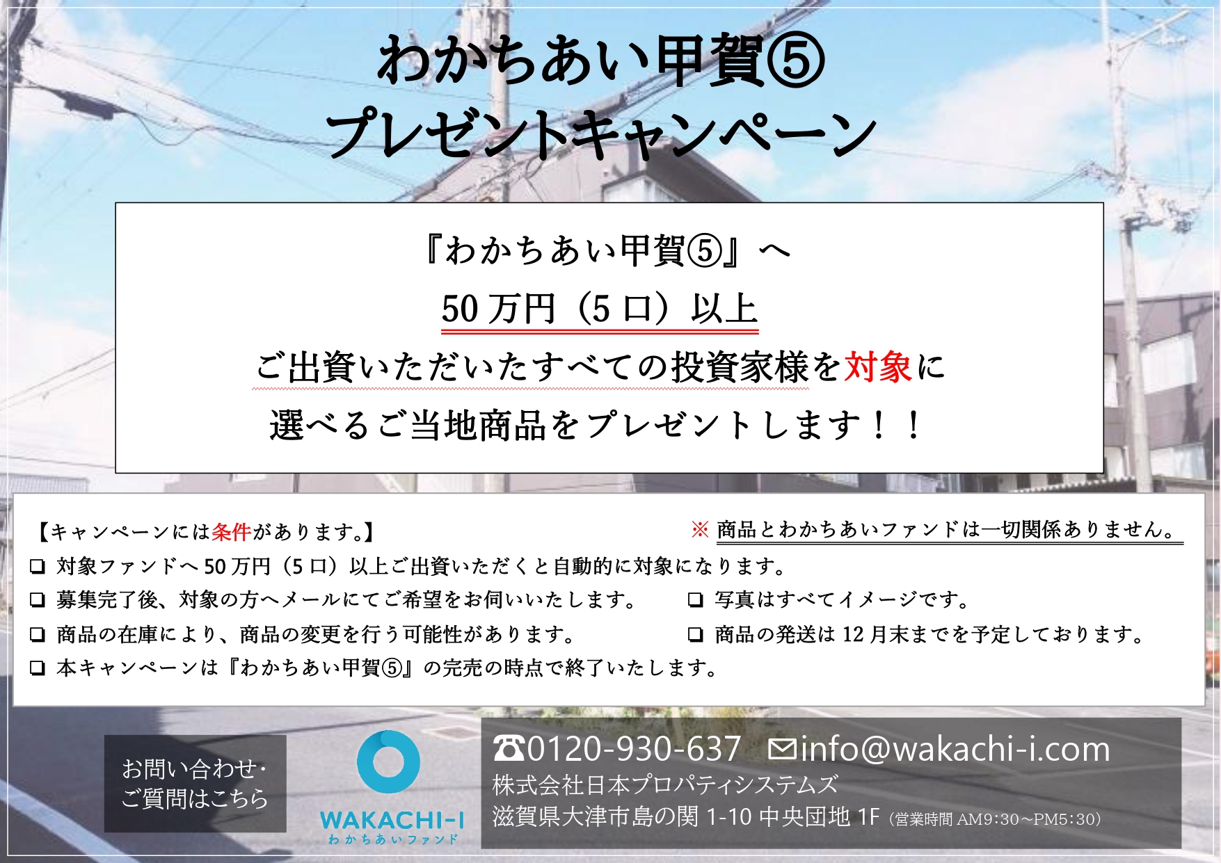 | 条件詳細 | 「わかちあい甲賀⑤」に50万円以上出資する |