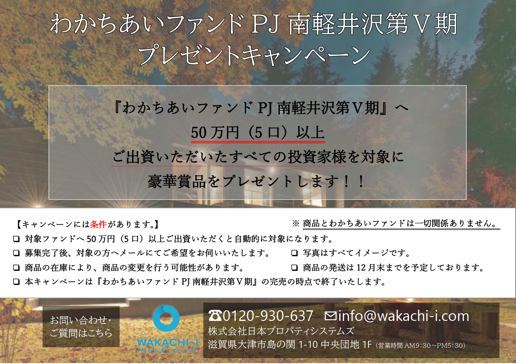 | 条件詳細 | 「わかちあいファンドPJ南軽井沢第Ⅴ期」に50万円以上出資する |